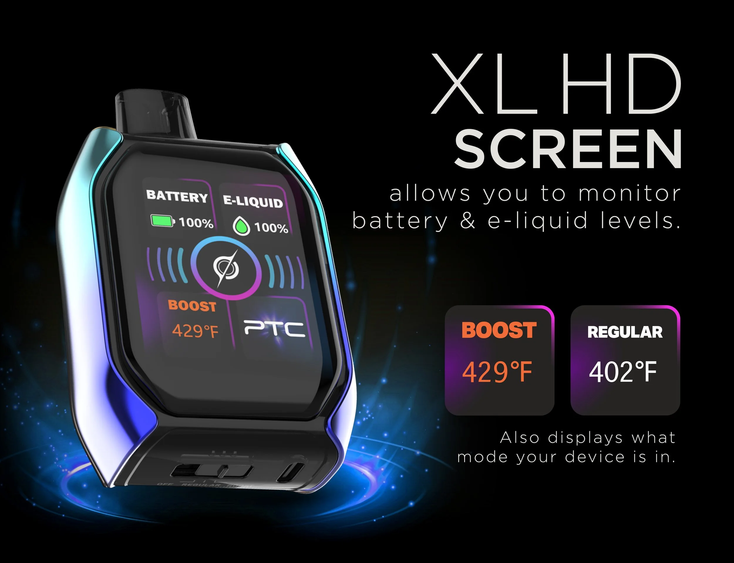 AURA is purpose-built for users who expect more from their vape. With a robust 800mAh battery and dual-mode options, users can switch between Regular Mode, providing an incredible 25,000 puffs, or Boost Mode for an amplified experience with 15,000 puffs. This dual capacity makes AURA one of the most flexible and long-lasting disposables on the market. An XL HD screen and precise temperature management give users real-time control and a smooth draw every time.