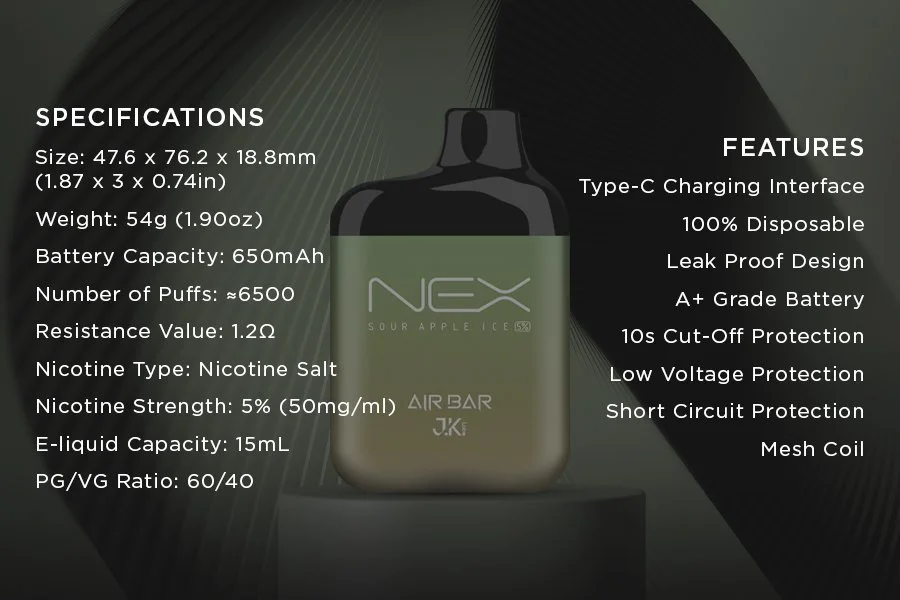 The Air Bar NEX is the second generation of our box-type devices. It has not only been entirely redesigned on the outside, but the inside features a complete revolution as well. We have pushed its autonomy even further with up to 6500 puffs. It is fully rechargeable, with a new battery generation, a new mesh coil, and cotton wick. NEX is not only our next generation of products, it is the next generation of all disposable vape devices.