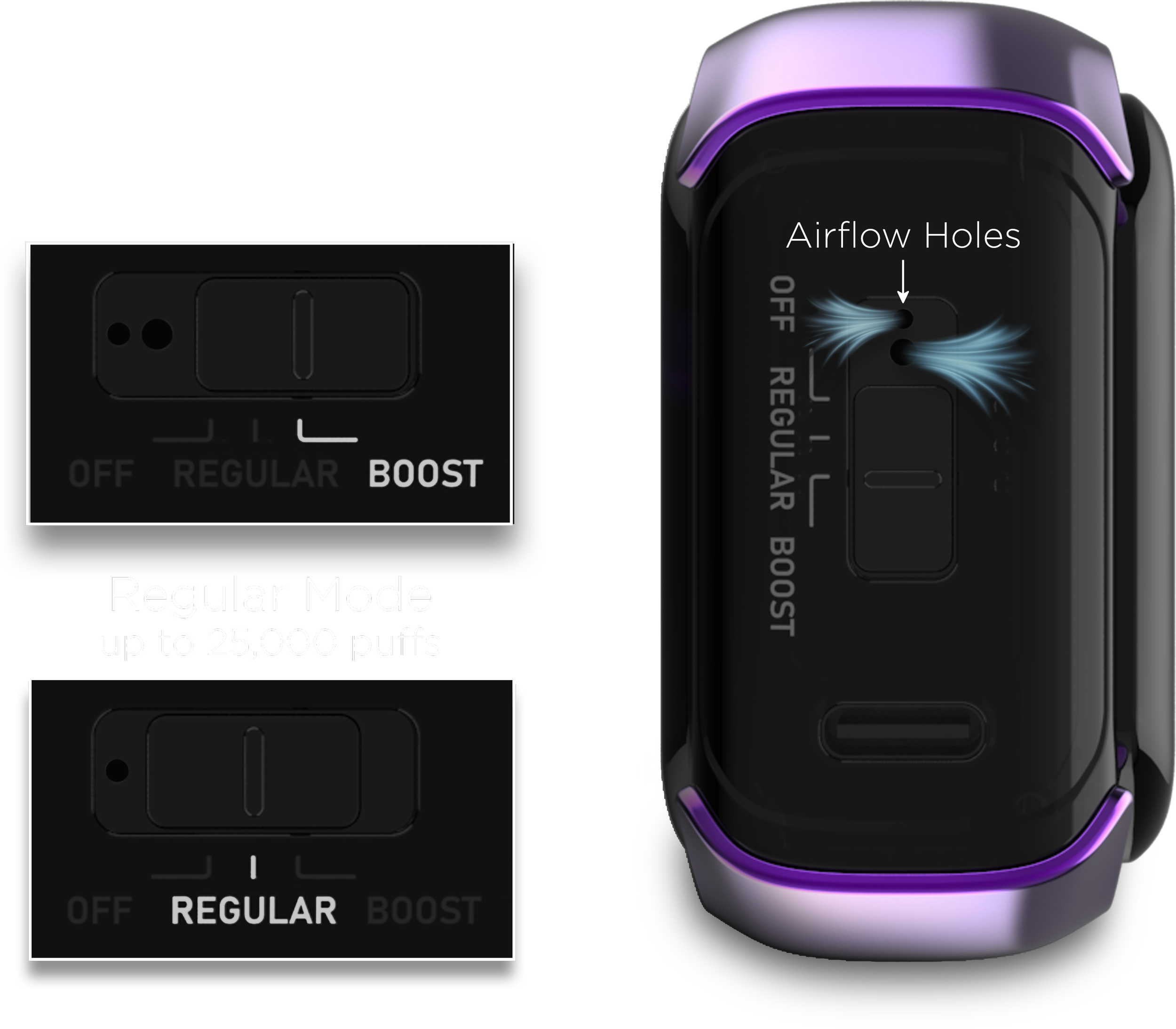 XL HD screen allows to monitor battery & e-liquid levels. It also displays what mode your device is in, Boost or Regular.