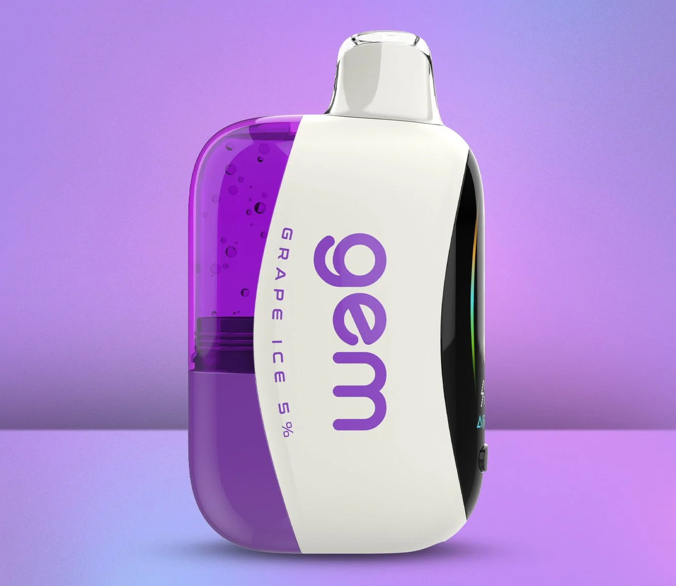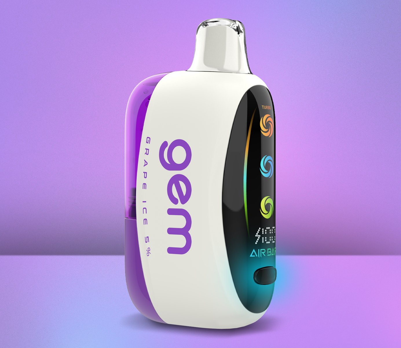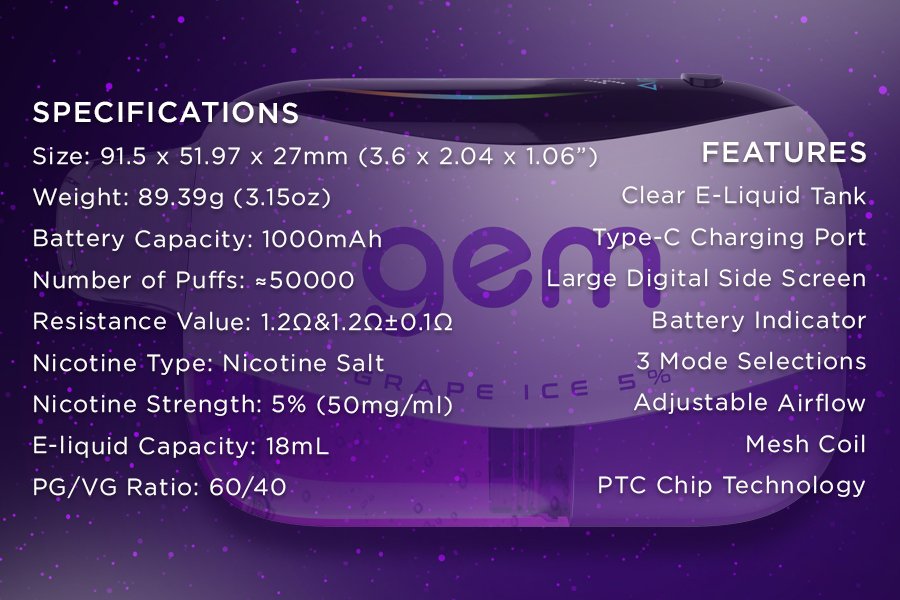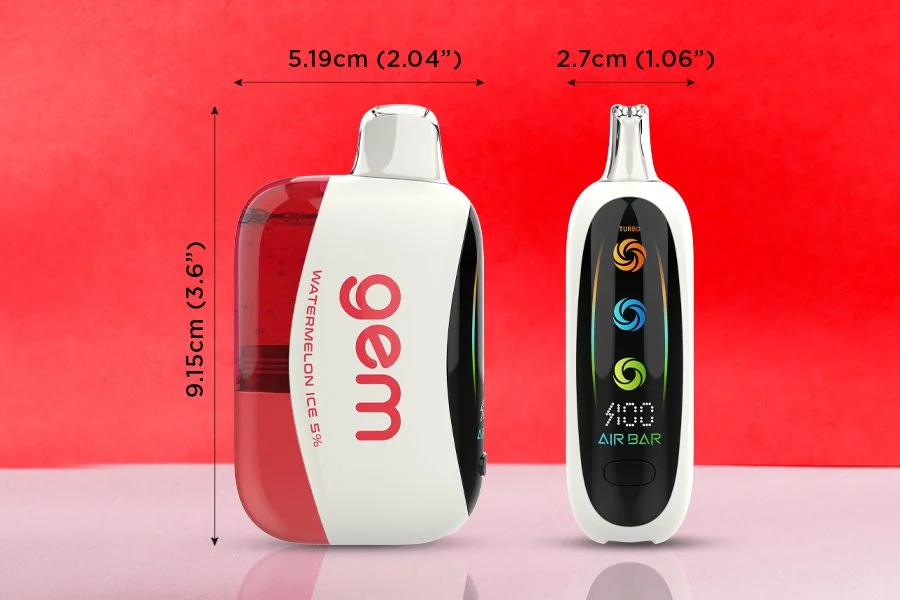 Air Bar Gem features a sleek design with a large digital side screen that provides real-time monitoring of battery life and mode setting. The innovative technology of a preheating coil and mesh coil ensures optimal flavor delivery and consistent vapor production throughout its lifespan. Gem features a clear tank for easy e-liquid monitoring and airflow adjustment making Gem a standout choice for vapers seeking a premium disposable experience.